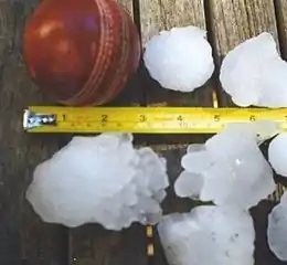 ![]() 风暴期间砸下的冰雹,左上角是颗直径7厘米的板球,用于对比 | |