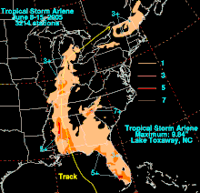 ![]() 协调世界时2005年6月11日下午16点45分热带风暴阿琳的卫星照片 | |