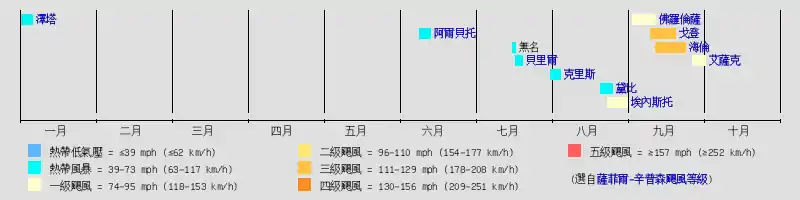 | 风暴名称 | 持续日期 | 风暴最高强度 | 最大持续风速 | 最低气压 (百帕) |