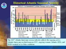 每年飓风季开始前,包括科罗拉多州立大学威廉·M·格雷博士、菲利普·克罗兹巴赫()及其同僚在内的一些飓风专家会发布飓风活动预测,其预测和美国国家海洋和大气管理局相互独立。克罗兹巴赫的团队认定,1950到2000年间的每年大西洋飓风季平均会形成9.6场热带风暴,5.9场飓风和2.3场大型飓风[注 1]。而美国国家海洋和大气管理局则认为一个平均水平的大西洋飓风季会形成6至14场获得命名的风暴,其中4到8场会成为飓风,1至3场会达到大型飓风强度。[5][6]