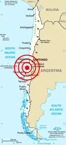 2010年智利大地震发生在智利中南部马乌莱大区当地时间2010年2月27日3时34分(UTC 6時34分),震级最初报道为矩震级(Mw)8.3至8.5,后修正为8.8[7],是當地自1960年智利9.5大地震后震级最大的地震。此次地震震源深度35公里,震央位于智利第二大城市康赛普西翁东北偏北方向115公里[8]、智利首都圣地亚哥西南方向325公里处。智利首都圣地亚哥和阿根廷部分城市有震感。地震持续了約10至90秒。
