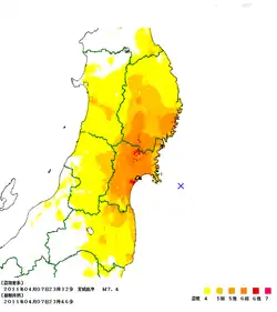 2011年4月宫城地震是日本宫城縣东部海域於7日深夜发生的一場Mw7.1(或Mj7.4)的地震,震中位在仙台市以東约66公里(41英里),本次地震亦是屬於2011年日本东北地方太平洋近海地震的一次余震[1]。地震发生后日本氣象廳對東北地方太平洋沿岸发布了海啸警報,並在90分鐘之後解除[5]。