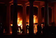 反对派向政府下达最后通牒,要求双方在晚上8点停火。大火在冲突地区蔓延,该地区一幢面积40平方米、楼高七层大楼的一楼商铺(位于两条博物馆的后巷)被火烧毁[64]。大火是由阻断格鲁舍夫斯基大街的橡胶轮胎燃烧导致的。烧轮胎为示威者提供烟幕[64]。