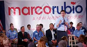 2015年4月13日,曾任佛羅里達州眾議院議長(2006年-2008年)、現任美國參議員(2011年就職)以及美國國會及行政部門中國問題委員會共同主席的馬可·魯比奧於邁阿密市中心的自由塔宣布投入2016年美國總統選舉[2]。而在2012年美國總統選舉的時候,馬可·魯比奧已經被提名為當時共和黨的參選人米特·羅姆尼的副總統人選之一。因此在2016年的總統選舉中,共和黨也考慮提名馬可·魯比奧為總統候選人[3]。魯比奧也是第二個競選美國總統的古巴裔美國人。在本州佛羅里達州初選落敗後宣佈退選[4]。 背景2012年總統選舉![]() 魯比奧參議員在2014年保守政治行動會議上發言 早在2011年1月,就有傳言說馬可·魯比奧可能會尋求競選總統或副總統,但之後他表示沒有興趣成爲總統或副總統候選人[5]。儘管如此,依然有許多猜測認爲米特·羅姆尼可能選擇他作爲競選搭檔[6]。2012年,魯比奧位列共和黨總統候選人米特·羅姆尼的副總統候選人提名名單中五人之一[7],但最終羅姆尼選擇了威斯康星州衆議員保羅·萊恩[8]。 2016年總統選舉![]() 魯比奧在新罕布什爾州Salem對選民演講 2015年1月,魯比奧開始準備競選總統,他接觸捐助者,並任命顧問。魯比奧還在一次籌款活動前指示他的助手「爲總統競選而準備」[9]。 競選活動2015年3月30日,魯比奧通過福斯新聞和社交媒體表示,他將在4月13日於佛羅里達州邁阿密作出「重大公佈」。雖然他沒有說明是否涉及競選參議員連任或競選總統,大多數媒體認爲,魯比奧將宣佈參選總統。他在邁阿密市中心的自由塔宣佈了這個消息[2][3]。魯比奧在演講中說自己具有新一代美國人的前瞻性和領導力,此外,他還宣佈不會尋求連任參議員[2][10]。魯比奧是第四個宣佈投入2016年總統大選的主要政黨成員。 參考資料
