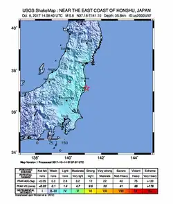 2017年10月福岛近海地震是2017年10月6日23时56分40秒发生于日本福岛县近海的一次地震,是一次2011年日本東北地方太平洋近海地震[註 1]的余震[7],同时也是日本气象厅所发布的日本附近地区主要被害地震列表中的一次地震[8]。地震规模为Mj 5.9级、MW 5.7级[註 2],震源深度约为53.0千米[3][註 3]。本次地震触发了2017年日本气象厅第6次紧急地震速报(警报)[11],且引发了整个东北地方和关东地方的震动[12]。位于福岛县滨通地区的楢葉町和川内村观测到最大震度5弱。截止2017年10月8日,共造成1人受伤[6]。