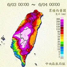 6月1日,臺灣中南部山區受西南氣流影響而出現降雨。2日凌晨,梅雨鋒面接觸北部陸地,凌晨2時至中午12時降雨集中在北北基,於入夜後南移,當晚10時至翌日(3日)清晨7時降雨則集中在臺灣中南部山區,多處測站皆測得達超大豪雨標準的強降雨。3日,鋒面先滯留於中臺灣,入夜後開始北抬,從而造成臺灣北部與中南部山區持續降雨。4日,西南氣流逐漸減弱,降雨明顯趨緩。在此期間,北部、中部、南部山區皆降下短延時降雨強度紀錄新高,其中新北市三芝區與雲林縣草嶺之最大三小時累積雨量均突破210毫米,高雄市南天池地區總累積雨量更高達1446毫米[9][10]。