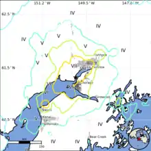 另据欧洲地中海地震中心测定,本次地震震级为矩震级7.0级,震源深度31千米,震中附近最大烈度为欧洲宏观地震度量8(VIII)度[3]。俄罗斯科学院地球物理研究所的140个地震台站记录到了这场地震,据俄科学院推算称,本次地震的震级达体波震级7.0级、面波震级7.0级,震源深度33千米,最大烈度达梅德韦杰夫·施蓬霍伊尔·卡尔尼克地震烈度表8-8.5度,震中位于北纬61.54度、西经150.04度的南阿拉斯加地区[4]。