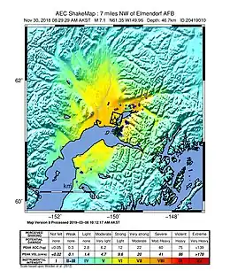 2018年安克雷奇地震,是2018年11月30日发生于美国阿拉斯加州安克雷奇埃尔门多夫-理查森联合基地附近的地震,震中距安克雷奇市区约18千米[6]。其震中位于北纬61.34度、西经139.94度,地震震级为Mw 7.0级,震源深度约40.9千米。