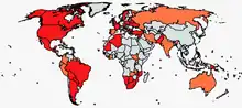新冠疫情爆發後時任國家元首與政府首腦曾確診的國家,紅色為實際上的最高領導人曾確診,橙色為虛位元首或副職領導人曾確診