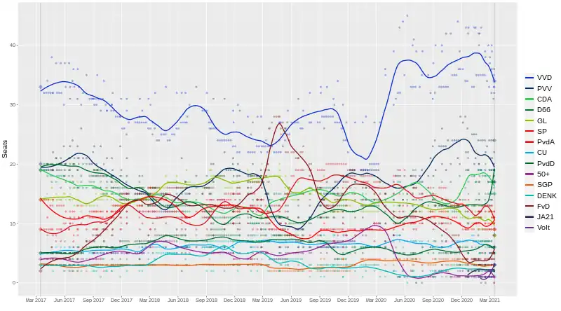 2017年大选是在自由民主人民党(VVD)和工党(PvdA)联合执政五年后举行的。工党在选举中惨败,从38个席位减少到9个席位,而自由民主人民党失去8个席位,从41个席位减少到33个席位,但仍然是最大的政党。自由党(PVV)以20个席位位居第二,比2012年大选赢得的席位多5席,基督教民主呼吁(CDA)新增6席,共赢得19席,民主66(D66)新增7席,共赢得19席,绿色左派(GL)新增10席,共赢得14席,社会党(SP)新增1席,赢得14席。这次选举有两个新政黨进入众议院:思考党和民主论坛(FvD),分别赢得3个和2个席位。另外四个较小的政党在众议院仍有代表:基督教联盟(CU)和爱护动物党(PvdD)各有5个席位,50+有4个席位,改革政治党(SGP)有3个席位。作为最大的政党,VVD率先组建了一个联盟,并于3月16日任命伊迪丝·席佩斯为该联盟的侦察员(verkenner)。[4]