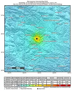 2023年积石山县地震是指在北京时间2023年12月18日23时59分发生于甘肃省临夏回族自治州积石山保安族东乡族撒拉族自治县的一次Ms6.2地震,震源深度约为10千米,震中柳沟乡距离县城约8公里,最大烈度为IX度(CSIS,CEA)[6][7][8]這次淺层逆衝斷層地震襲擊了甘肅省积石山县和青海省海东市交界處的一個人口稠密地區。兩省至少有151人死亡、980人受傷[2][5][4]。這使其成為自2014年鲁甸地震以來中國最嚴重的地震[9]。