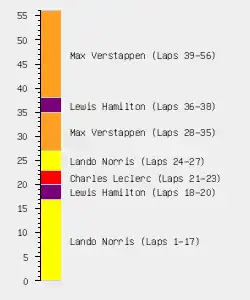 赛后车检时,汉密尔顿和勒克莱尔被发现赛车底板磨损超出了规则允许的范围,因此被取消成绩(DSQ)。这次处罚让兰多·诺里斯和小卡洛斯·塞恩斯分获亚军和季军,也让洛根·萨金特获得了他F1职业生涯的第一个积分。[23]勒克莱尔也是自2004年加拿大大奖赛的拉尔夫·舒马赫之后又一位被DSQ的杆位车手;他更成为了首位“不幸”集齐杆位发车最终DNS、DNF、DSQ[lower-alpha 2]的法拉利车手。[24][25]萨金特则凭借本场的第十名,成为30年来首个获得积分的美国F1车手(上一位是1993年意大利大奖赛中获得季军的迈克尔·安德烈蒂)。[26][27]