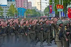 ![]() 2015年在平壤閱兵的朝鮮人民軍士兵,可見他們的制式步槍仍為68式(圖中出現的為衍生型68-1式) | |