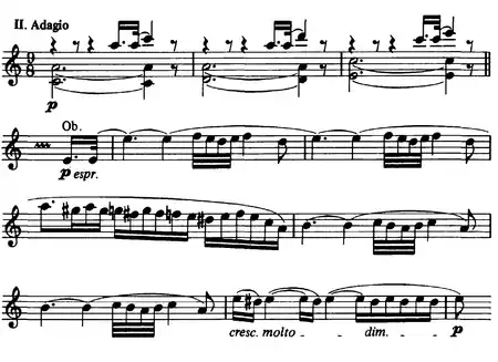 這個樂章與古諾D大調交響曲的第二樂章相當相似,二首作品在發展部都有一段小賦格,手法也各自近似,包括輕聲(sotto voce)和斷奏等,句法(句長)也接近。此外,第一主題各自在再現部由弦樂演奏,使人回想起賦格和發展段。