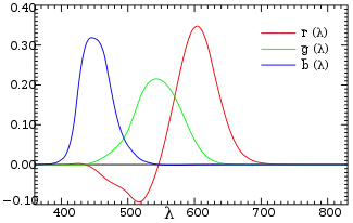 经过CIE的特别委员会的深思熟虑之后确定了颜色匹配函数和原色(Fairman 1997)。在图的短波和长波的侧的取舍点某种程度上是随意选择的;人类眼睛实际上能看到波长直到810 nm的光,但是敏感度要数千倍低于绿色光。定义的这些颜色匹配函数叫做“1931 CIE标准观察者”。注意: 不是指定每种原色的明度,而是將这种曲线常规標準化为在其下有固定的面积。这个面积按如下规定而固定为特定值