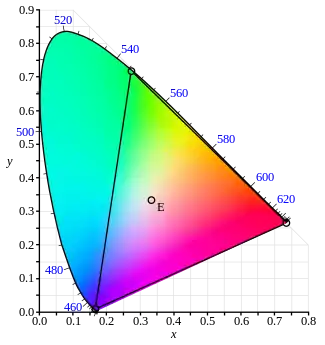 - 由于色度定义和要求x和y为正值的优势,可以在三角形[1,0],[0,0],[0,1]内见到所有颜色的色域。在实践中必须把色域完全的充入这个空间中。