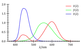 在CIE XYZ色彩空間中,三色刺激值並不是指人類眼睛對短、中和長波(S、M和L)的反應,而是一組稱為X、Y和Z的值,約略對應於紅色、綠色和藍色(但要留意X、Y和Z值並不是真的看起來是紅、綠和藍色,而是從紅色、綠色和藍色導出來的參數),並使用CIE 1931 XYZ顏色匹配函數來計算。兩個由多種不同波長的光混合而成的光源可以表現出同樣的顏色,這叫做「同色異譜」(metamerism)。當兩個光源對標準觀察者(CIE 1931標準色度觀察者)有相同的視現顏色的時候,它們即有同樣的三色刺激值,而不管生成它們的光的光譜分佈如何。