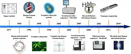 1990年代中後期開發了幾種新的DNA測序方法,並於 2000年在商業DNA測序儀中實施。這些方法統稱為“下一代”或“第二代”測序 (NGS) 方法,以便將它們與包括桑格测序在內的早期方法區分開來。 與第一代測序相比,NGS 技術的典型特徵是高度可擴展,允許一次對整個基因組進行測序。通常,這是通過將基因組片段化成小塊、隨機採樣片段並使用多種技術之一對其進行測序來實現的,例如下面描述的那些。 整個基因組測序是可能的,因為在一個自動化過程中同時對多個片段進行測序(命名為“大規模並行”測序)。
