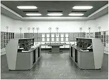 Deltar的布局。 1.類比河段2.外圍設備(打孔帶)3.操作人員控制器4.測量控制器5.類比輸出(記錄器)6.數位輸出(打孔帶)7.設計表(河道配置)8.造風機。