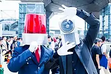 - 头部为摄影机的西装男。外套为黑色,有2粒纽扣[4]。佩戴黑色细领带及白色手套[5]。