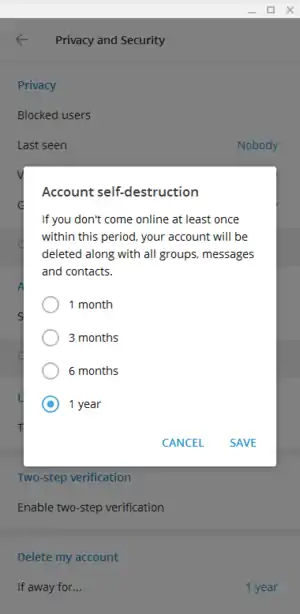 为了节省服务器资源,若用户长时间不登录Telegram账号,系统会自动予以销毁(即永久删除),用户可以设置多久后自动销毁该账号,时长分别有一个月后、三个月后、半年后和一年后(默认时长为半年后),用户也可手动销毁账号。